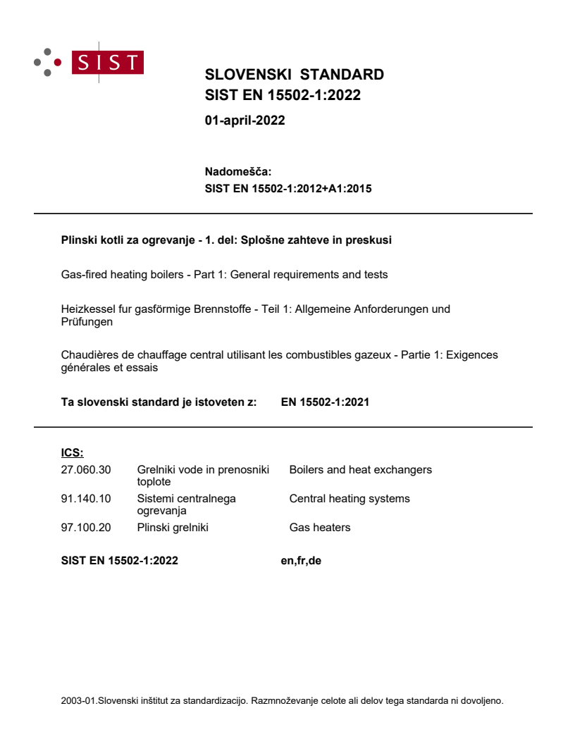 EN 15502-1:2012+A1:2015 - Gas-fired heating boilers - Part 1: General requirements and tests - Effective Date