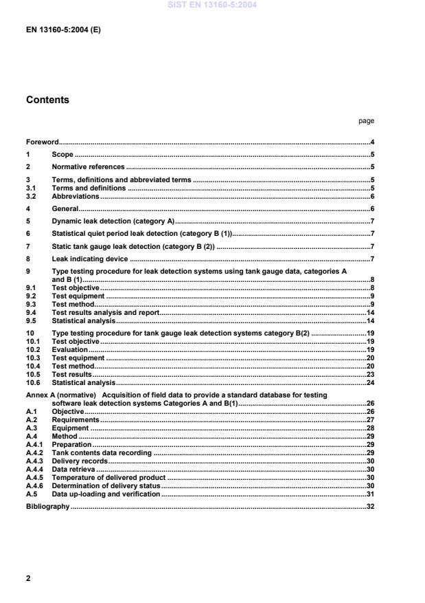 is the criterion or threshold for indicating a leak B is the estimated bias of the system SD is the standard deviation tb is the two-sample t-test bias 4 General General principles shall be according to EN 13160-1. Tank gauge leak detection systems shall be divided into two categories of operation: Category A: Systems providing leak detection for tanks and pipes, connected with the tank; Category B: Systems providing leak detection for tanks only. The minimum operational performance requirements for each category are contained in Table 1. SIST EN 13160-5:2004