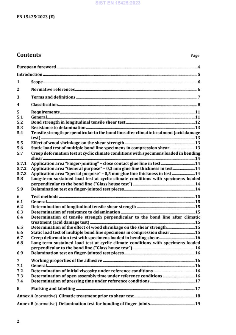 - Annexes: normative annexes for climatic treatment and finger-joint delamination tests; informative Annex C provides guidance on bonding with water-spraying (does not mandate or prohibit).