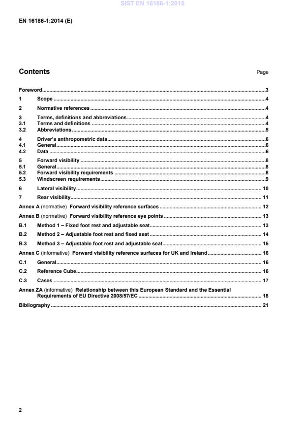 Contents Page Foreword .3 1 Scope .4 2 Normative references .4 3 Terms, definitions and abbreviations .4 3.1 Terms and definitions .4 3.2 Abbreviations .5 4 Driver’s anthropometric data .6 4.1 General .6 4.2 Data .6 5 Forward visibility .8 5.1 General .8 5.2 Forward visibility requirements .8 5.3 Windscreen requirements .9 6 Lateral visibility . 10 7 Rear visibility . 11 Annex A (normative)