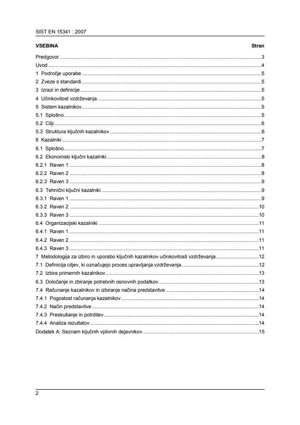Ta evropski standard opisuje sistem za upravljanje ključnih kazalnikov učinkovitosti vzdrževanja, s katerimi se meri učinkovitost upravljanja na področju vplivnih dejavnikov, kot so ekonomski, tehnični in organizacijski vidiki, za oceno in izboljšanje učinkovitosti in uspešnosti s ciljem doseganja odličnosti pri vzdrževanju tehničnih sredstev.