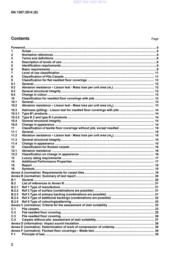 Flocked floor coverings – Water Impermeability Test . 32 G.1 Principle of test . 32 G.2 Equipment . 32 G.3 Conditioning and preparation of test specimens . 32 G.4 Test procedure . 32 G.5 Assessment of results . 32 G.6 Test report . 32 Bibliography . 34 SIST EN 1307:2014