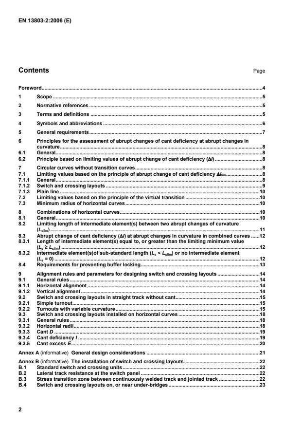 EN 13803-2:2006 is a standard published by the European Committee for Standardization (CEN). Its full title is "Railway applications - Track - Track alignment design parameters - Track gauges 1435 mm and wider - Part 2: Switches and crossings and comparable alignment design situations with abrupt changes of curvature". This standard covers: This European Standard specifies the rules and values for the track alignment design parameters used to determine the maximum operating speeds over tracks with abrupt changes in curvature and, consequently, abrupt changes of cant deficiency. Such conditions occur in the following situations: - in the diverging tracks in switch and crossing layouts; - when it is not practical to design an alignment with transition curves; - if the length of a transition curve is less than the minimum required for plain line track. Engineering requirements specific to the mechanical behaviour of switch and crossing components and subsystems are to be found in the relevant standards. This European Standard presupposes that the homologation of the operating vehicles will be valid and specified for conditions corresponding to the limiting values specified in this European Standard. This European Standard is applicable to abrupt changes in curvature in switch and crossing layouts and plain lines with track gauges of 1435 mm and wider. Annex C is applicable to track gauges wider than 1435 mm. This European Standard specifies the requirements for preventing buffer locking. The limiting values specified in this European Standard, when applied at the switch toe, are for switches with tangential geometry (as defined in EN 13232-1). This European Standard need not be applicable to certain urban and suburban lines. This European Standard is not applicable to track alignment requirements for tilting body vehicles. However, Annex H draws the designer’s attention to the consequences and the restrictions imposed when tilting vehicles are operated over switch and crossing layouts and alignments without transition curves.