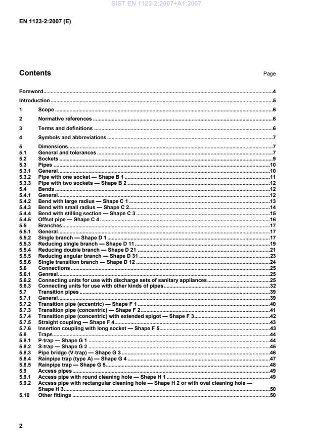 EN 1123-2:2007 (E) 2 Contents Page Foreword.4 Introduction.5 1 Scope.6 2 Normative references.6 3 Terms and definitions.6 4 Symbols and abbreviations.7 5 Dimensions.7 5.1 General and tolerances.7 5.2 Sockets.9 5.3 Pipes.10 5.3.1 General.10 5.3.2 Pipe with one socket — Shape B 1.11 5.3.3 Pipe with two sockets — Shape B 2.12 5.4 Bends.12 5.4.1 General.12 5.4.2 Bend with large radius — Shape C 1.13 5.4.3 Bend with small radius — Shape C 2.14 5.4.4 Bend with stilling section — Shape C 3.15 5.4.5 Offset pipe — Shape C 4.16 5.5 Branches.17 5.5.1 General.17 5.5.2 Single branch — Shape D 1.17 5.5.3 Reducing single branch — Shape D 11.19 5.5.4 Reducing double branch — Shape D 21.21 5.5.5 Reducing angular branch — Shape D 31.23 5.5.6 Single transition branch — Shape D 12.24 5.6 Connections.25 5.6.1 Genreal.25 5.6.2 Connecting units for use with discharge sets of sanitary appliances.25 5.6.3 Connecting units for use with other kinds of pipes.32 5.7 Transition pipes.39 5.7.1 General.39 5.7.2 Transition pipe (eccentric) — Shape F 1.40 5.7.3 Transition pipe (concentric) — Shape F 2.41 5.7.4 Transition pipe (concentric) with extended spigot — Shape F 3.42 5.7.5 Straight coupling — Shape F 4.43 5.7.6 Insertion coupling with long socket — Shape F 5.43 5.8 Traps.44 5.8.1 P-trap — Shape G 1.44 5.8.2 S-trap — Shape G 2.45 5.8.3 Pipe bridge (V-trap) — Shape G 3.46 5.8.4 Rainpipe trap (type A) — Shape G 4.47 5.8.5 Rainpipe trap — Shape G 5.48 5.9 Access pipes.49 5.9.1 Access pipe with round cleaning hole — Shape H 1.49 5.9.2 Access pipe with rectangular cleaning hole — Shape H 2 or with oval cleaning hole —