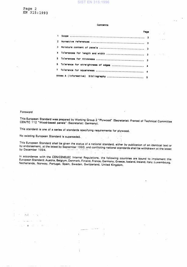 EN 315:1993 is a standard published by the European Committee for Standardization (CEN). Its full title is "Plywood - Tolerances for dimensions". This standard covers: This European Standard defines tolerances for dimensions of plywood panels (lenght, width,thickness) and tolerances for squareness and edge straightness.