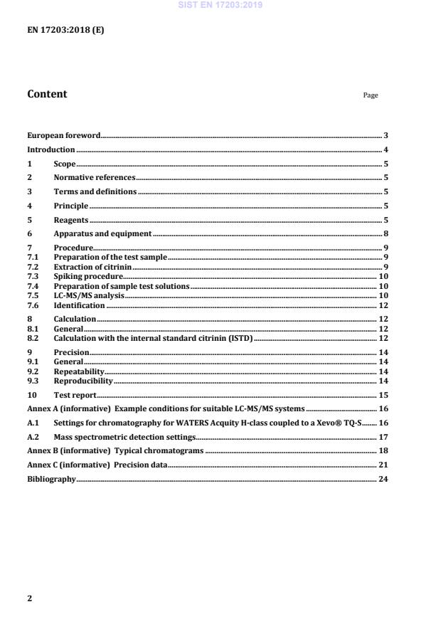 European foreword . 3 Introduction . 4 1 Scope . 5 2 Normative references . 5 3 Terms and definitions . 5 4 Principle . 5 5 Reagents . 5 6 Apparatus and equipment . 8 7 Procedure. 9 7.1 Preparation of the test sample . 9 7.2 Extraction of citrinin . 9 7.3 Spiking procedure . 10 7.4 Preparation of sample test solutions . 10 7.5 LC-MS/MS analysis . 10 7.6 Identification . 12 8 Calculation . 12 8.1 General . 12 8.2 Calculation with the internal standard citrinin (ISTD) . 12 9 Precision . 14 9.1 General . 14 9.2 Repeatability . 14 9.3 Reproducibility . 14 10 Test report . 15 Annex A (informative)