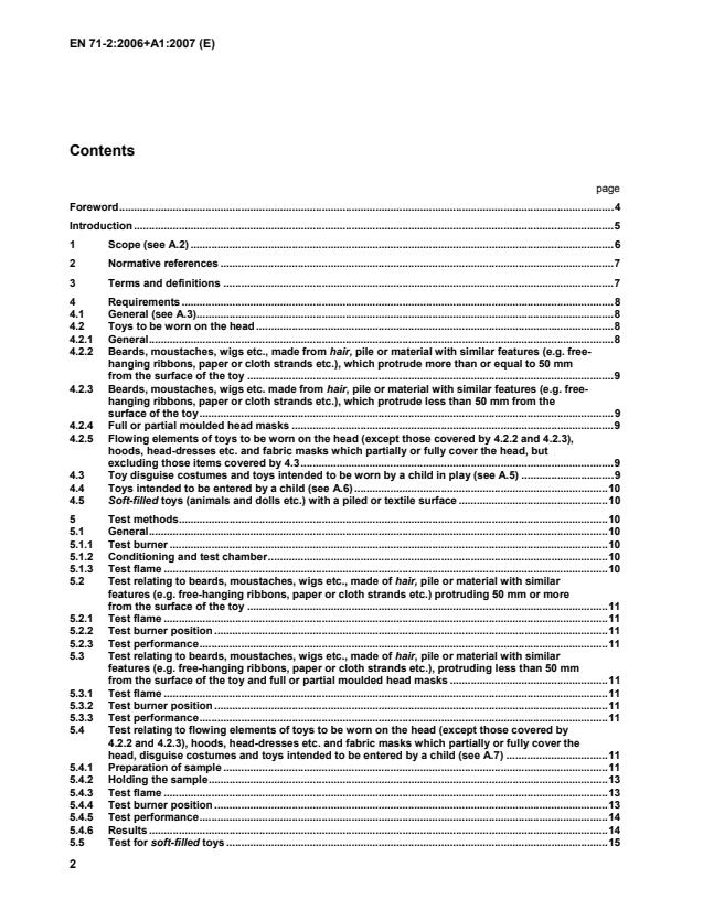 EN 71-2:2006+A1:2007 is a standard published by the European Committee for Standardization (CEN). Its full title is "Safety of toys - Part 2: Flammability". This standard covers: This European Standard specifies the categories of flammable materials which are prohibited in all toys, and requirements concerning flammability of certain toys when they are subjected to a small source of ignition. The test methods described in Clause 5 are used for the purposes of determining the flammability of toys under the particular test conditions specified. The test results thus obtained cannot be considered as providing an overall indication of the potential fire hazard of toys or materials when subjected to other sources of ignition. This European Standard includes general requirements relating to all toys and specific requirements and methods of test relating to the following toys, which are considered as being those presenting the greatest hazard: - toys to be worn on the head: beards, moustaches, wigs etc. made from hair, pile or material with similar features; moulded and fabric masks; hoods, head-dresses etc.; flowing elements of toys to be worn on the head, but excluding paper novelty hats of the type usually supplied in party crackers; - toy disguise costumes and toys intended to be worn by a child in play; - toys intended to be entered by a child; - soft-filled toys (animals and dolls etc.) with a piled surface or textile surface. NOTE Additional requirements for flammability of electric toys are specified in EN 50088, Safety of electric toys and EN 62115, Electric toys - Safety (IEC 62115:2003 + A1:2004, modified)