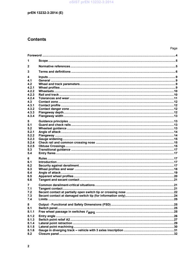 prEN 13232-3 rev is a draft published by the European Committee for Standardization (CEN). Its full title is "Railway applications - Track - Switches and crossings for Vignole rails - Part 3: Requirements for wheel/rail interaction". This standard covers: This part of this European Standard defines the main wheel/track interaction criteria to be taken into account during the geometrical design of switches and crossings (S&C) layouts. It specifies: - characterisation of wheel and track dimensions; - geometric design principles for wheel guidance; - design principles for wheel load transfer; - deciding whether movable crossings are needed. These are illustrated by their application to turnout components: - switches; - crossings; - check rails, but the principles apply equally to more complex layouts. There are also simplified definitions of the safety and functional dimensions, which can be used in conjunction with the general principles as the basis for more in-depth assessment.