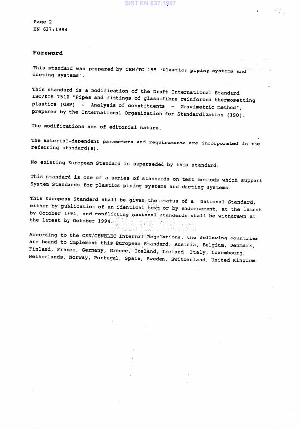 EN 637:1994/AC:1995 is a standard published by the European Committee for Standardization (CEN). Its full title is "Plastics piping systems - Glass-reinforced plastics components - Determination of the amounts of constituents using the gravimetric method". This standard covers: Plastics piping systems - Glass-reinforced plastics components - Determination of the amounts of constituents using the gravimetric method