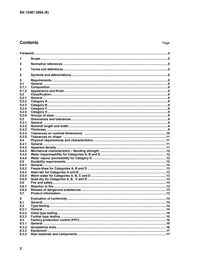 two types in accordance with their composition (see 5.1.1); four categories in accordance with their weather resistance (see 5.2.2 – 5.2.5); five classes in accordance with their bending strength (see 5.4.3); two groups of sizes in accordance with their method of installation (see 5.2.6); two levels in accordance with their dimensional tolerances (see 5.3.4). Type tests for each category are specified in Table 7 (6.2.1). 5.2.2 Category A Sheets which are intended for applications where they may be subjected to heat, high moisture and severe frost.
