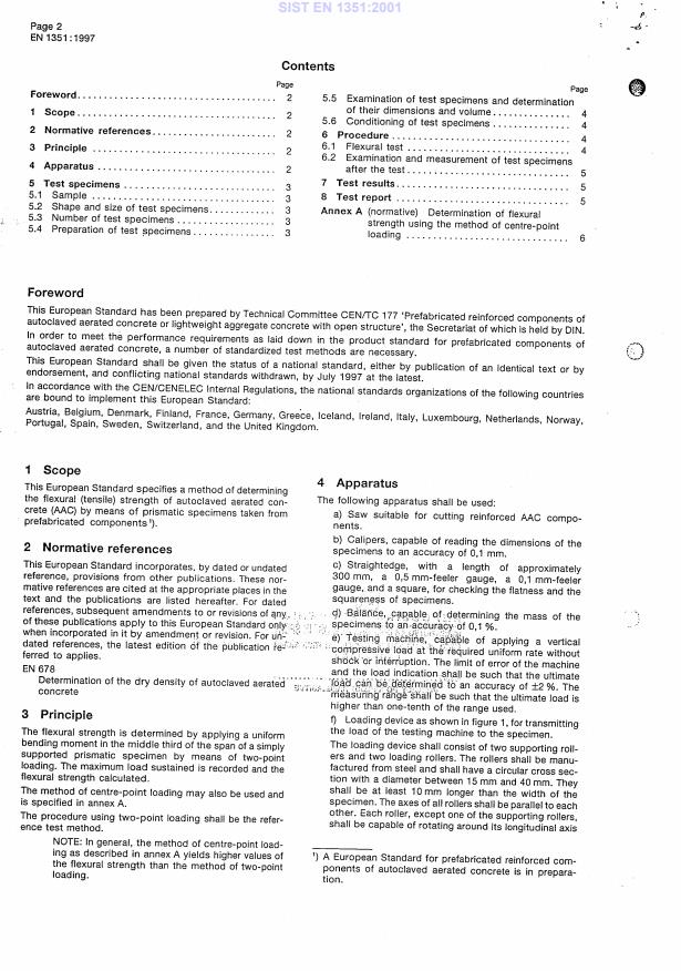 EN 1351:1997 is a standard published by the European Committee for Standardization (CEN). Its full title is "Determination of flexural strength of autoclaved aerated concrete". This standard covers: This European Standard specifies a method of determining the flexural (tensile) strength of autoclaved aerated concrete (AAC) by means of prismatic test spe- cimens taken from prefabricated components.