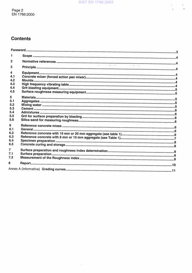 EN 1766:2000 is a standard published by the European Committee for Standardization (CEN). Its full title is "Products and systems for the protection and repair of concrete structures - Test methods - Reference concretes for testing". This standard covers: This European Standard specifies the composition, the characteristics and the preparation procedure of the reference substrates which are used in the test methods to measure performance requirements of products and systems for the repair and protection of concrete structures. The provisions of this standard are applicable to concrete with a maximum aggregate size of 16 mm or 20 mm and to micro-concrete with a maximum aggregate size of 8 mm.