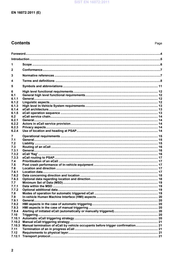 EN 15722. 2 Conformance Test requirements and conformance requirements are described in Clause 11. Conformance procedures will be specified in a separate deliverable and are outside of the scope of this European Standard. 3 Normative references The following referenced documents are indispensable for the application of this document. For dated references, only the edition cited applies. For undated references, the latest edition of the referenced document (including any amendments) applies. EN 15722:2011, Intelligent transport systems — eSafety — eCall minimum set of data (MSD) EN 16062:2011, Intelligent transport systems — eSafety — eCall high level application requirements (HLAP) EN ISO 24978, Intelligent transport systems — ITS safety and emergency messages using any available wireless media — Data registry procedures (ISO 24978:2009) ETSI TS 122 101, Universal Mobile Telecommunications System (UMTS); LTE; Service aspects; Service principles (Release 8) ETSI TS 124 008, Digital cellular telecommunications system (Phase 2+); Universal Mobile Telecommunications System (UMTS); LTE;Mobile radio interface Layer 3 specification; Core network protocols; Stage 3 (Release 8) ETSI TS 126 267, Digital cellular telecommunications system (Phase 2+); Universal Mobile Telecommunications System (UMTS); eCall data transfer; In-band modem solution; General description (Release 8) ETSI TS 126 268, Digital cellular telecommunications system (Phase 2+); Universal Mobile Telecommunications System (UMTS); eCall data transfer; In-band modem solution; ANSI-C reference code (Release 8) ETSI TS 126 269, Digital cellular telecommunications system (Phase 2+); Universal Mobile Telecommunications System (UMTS); eCall data transfer; In-band modem solution; Conformance testing (Release 8) SIST EN 16072:2011