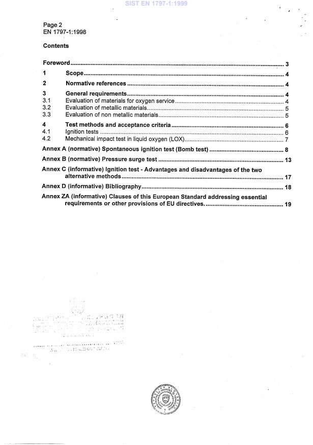 EN 1797-1:1998 is a standard published by the European Committee for Standardization (CEN). Its full title is "Cryogenic vessels - Gas/material compatibility - Part 1: Oxygen compatibility". This standard covers: This Standard specifies the general requirements and defines the testing methods for establishing oxygen compatibility of materials (metallic and non-metallic) to be used for the manufacture of cryogenic vessels and associated equipment. It mainly deals with materials that are normally or could be in contact with liquid/gaseous oxygen e.g., materials for cryogenic vessels used for the storage and/or transport of liquid oxygen. It also deals with the materials which can be in contact with oxygen enriched environment e.g. insulating materials used for nitrogen, neon, hydrogen and helium cryogenic vessels where air condensation is possible.