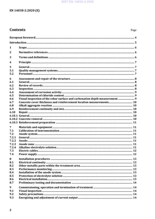 EN 14038-2:2020 is a standard published by the European Committee for Standardization (CEN). Its full title is "Electrochemical realkalization and chloride extraction treatments for reinforced concrete - Part 2: Chloride extraction". This standard covers: This document specifies a procedure for carrying out impressed current electrochemical chloride extraction from chloride bearing concrete in existing structures. It is applicable to atmospherically exposed parts of structures with ordinary reinforcement and/ or post-tensioned tendon ducts embedded in concrete. In the latter case, it is essential to verify that there is no risk of hydrogen embrittlement, if necessary by conducting trials and installing monitoring during the treatment. This document does not apply to concrete containing pre-stressing steel, which can suffer hydrogen embrittlement during chloride extraction, or to concrete containing coated or galvanized reinforcement. In case of post-tensioned, pre-stressing concrete, the endangered tendon strands can be shielded by the tendon ducts from unwanted and/or exceeded polarization into the cathodic range and respective water reduction.