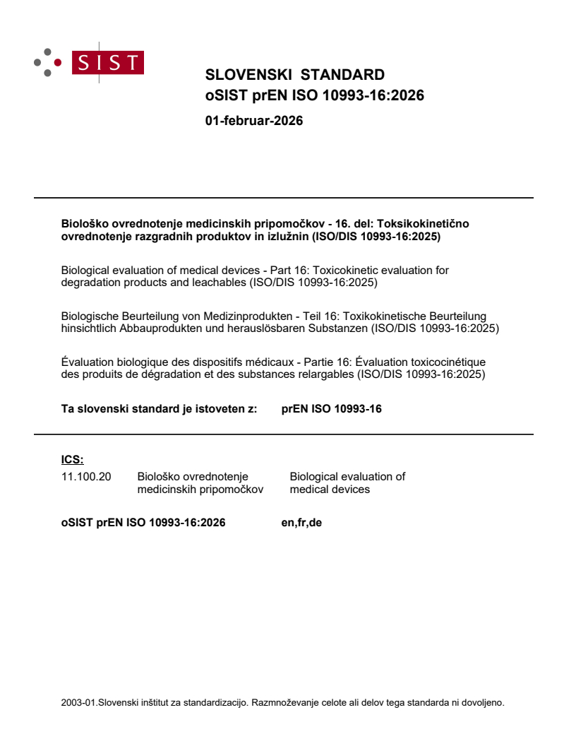 Biološko ovrednotenje medicinskih pripomočkov - 16. del: Toksikokinetično ovrednotenje razgradnih produktov in izlužnin (ISO/DIS 10993-16:2025)