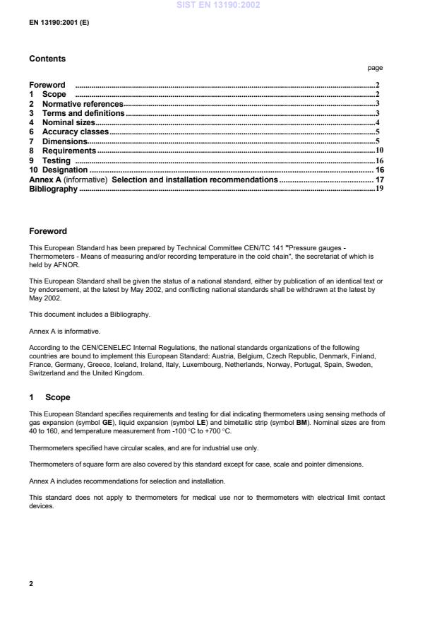 EN 13190:2001 is a CEN European Standard for industrial dial thermometers. It defines requirements, testing and marking for dial-indicating thermometers that use gas expansion (GE), liquid expansion (LE) or bimetallic strip (BM) sensing methods. The standard covers nominal sizes 40–160 and temperature capability from −100 °C to +700 °C. Instruments specified have circular scales (square forms covered except for case/scale/pointer dimensions). Annex A gives recommendations for selection and installation. The standard excludes medical thermometers and devices with electrical limit contacts.