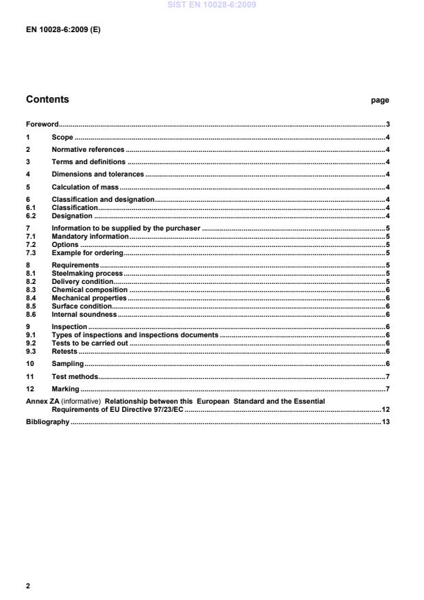 page Foreword . 3 1 Scope . 4 2 Normative references . 4 3 Terms and definitions . 4 4 Dimensions and tolerances . 4 5 Calculation of mass . 4 6 Classification and designation . 4 6.1 Classification . 4 6.2 Designation . 4 7 Information to be supplied by the purchaser . 5 7.1 Mandatory information . 5 7.2 Options . 5 7.3 Example for ordering . 5 8 Requirements . 5 8.1 Steelmaking process . 5 8.2 Delivery condition . 5 8.3 Chemical composition . 6 8.4 Mechanical properties . 6 8.5 Surface condition. 6 8.6 Internal soundness . 6 9 Inspection . 6 9.1 Types of inspections and inspections documents . 6 9.2 Tests to be carried out . 6 9.3 Retests . 6 10 Sampling . 6 11 Test methods . 7 12 Marking . 7 Annex ZA (informative)
