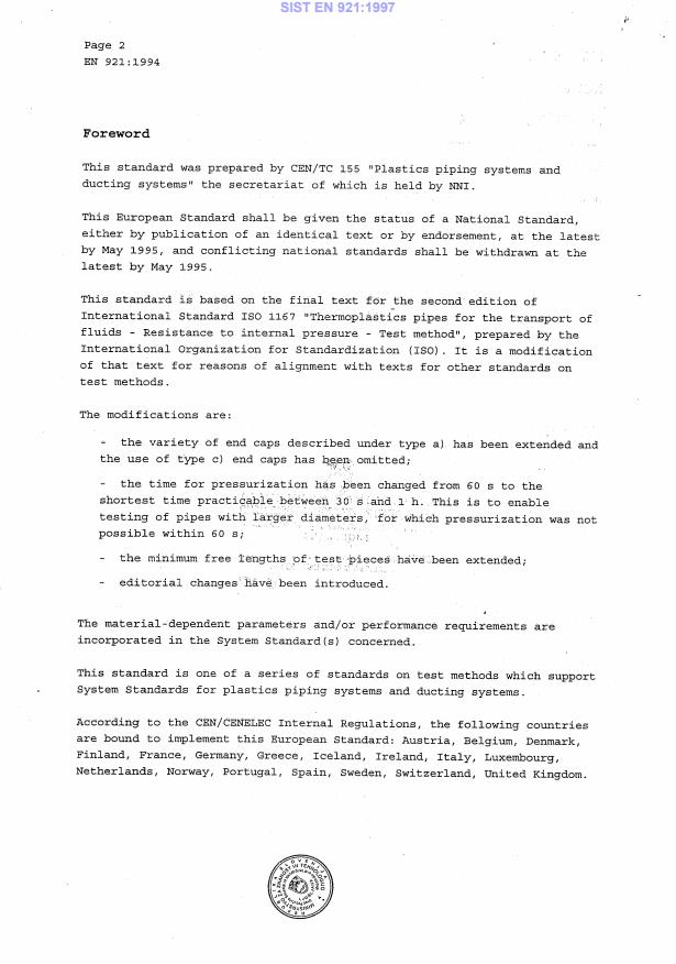 EN 921:1994/AC:1995 is a standard published by the European Committee for Standardization (CEN). Its full title is "Plastics piping systems - Thermoplastics pipes - Determination of resistance to internal pressure at constant temperature". This standard covers: Plastics piping systems - Thermoplastics pipes - Determination of resistance to internal pressure at constant temperature
