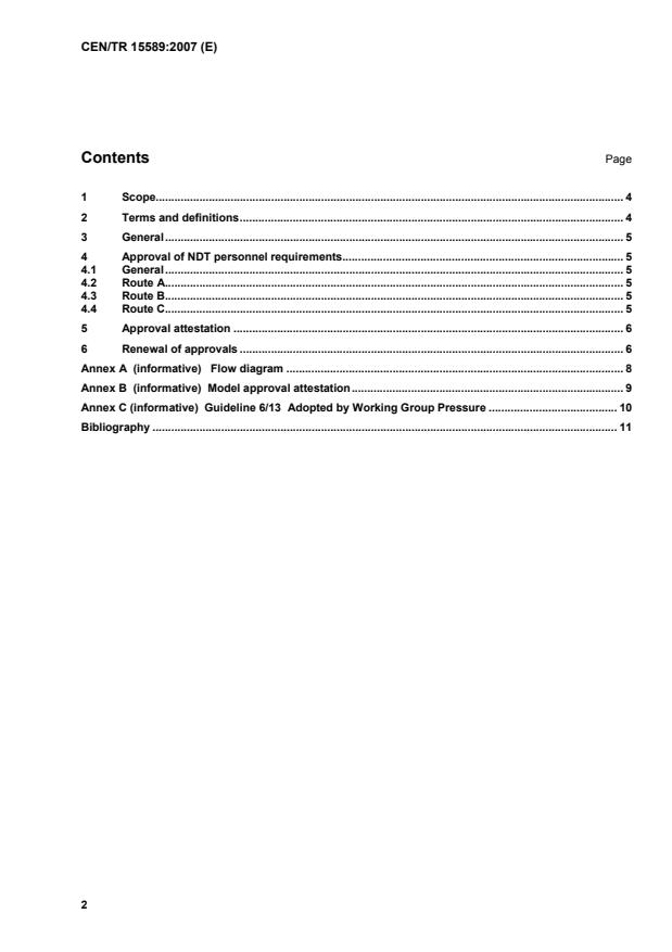 CEN/TR 15589:2007 is a technical report published by the European Committee for Standardization (CEN). Its full title is "Non destructive testing - Code of practice for the approval of NDT personnel by recognised third party organisations under the provisions of Directive 97/23/EC". This standard covers: This Technical Report provides a methodology for approval of NDT personnel under the provisions of Directive 97/23/EC, Annex 1, section 3.1.3. The provisions of Guideline 6/13 are detailed herein to ensure a consistent approach and a high level of confidence in the approval of NDT personnel by RTPO’s through widespread adoption of the criteria and approval processes detailed herein. A flow diagram illustrating this methodology is presented in Annex A.
