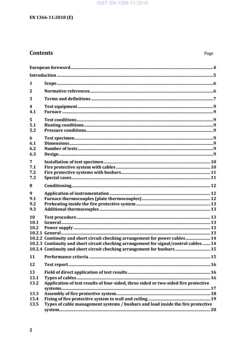 EN 1366-11:2018 is a standard published by the European Committee for Standardization (CEN). Its full title is "Fire resistance tests for service installations - Part 11: Fire protective systems for cable systems and associated components". This standard covers: This European Standard describes the method to evaluate the performance of protective systems for electrical cable and busbar systems in order to maintain the circuit integrity under fire conditions to classify the protective system according to EN 13501 3 for the P classification. The test examines the behaviour of cable protection systems exposed to fire from outside. The tests specified in this standard are not aimed for assessing the performance of the fire protective system and the penetration seal for maintaining the requirements of the penetrated wall or ceiling (classification E / I). This method is very different to EN 50200 for the PH classification and also to IEC 60331 11, IEC 60331 21, IEC 60331 23, and IEC 60331 25, which are not designed for fire protective systems for electrical cable systems. This standard should be used in conjunction with EN 1363 1. The test results apply to fire protective systems for electrical cable systems rated for voltages up to 1 kV. The test procedure should also be used to determine the performance of protective systems for use with data and optical cables, however, verification procedures for such cables are still under development. Proposals are given in Annex C. The protective system may include ventilation devices, inspection hatches, fixed or removable lids etc. The tests specified in this standard are not aimed for assessing the performance of sprayed or painted coatings (e.g. intumescent or ablative coating, plastic film, epoxy resin) and similar protective layers (e.g. wrap, bandage) applied directly on the cables or bus bars as fire protective system. Also, cables and bus bars with intrinsic resistance to fire, and without fire protective systems around, are excluded (see CENELEC standard EN 50577). This test method is not applicable for cabinets for electrical accessory containing bus systems, relays or similar. Dieses Prüfverfahren gilt nicht für Schaltschränke für elektrische Zubehörteile wie Bussysteme, Relais u. ä.