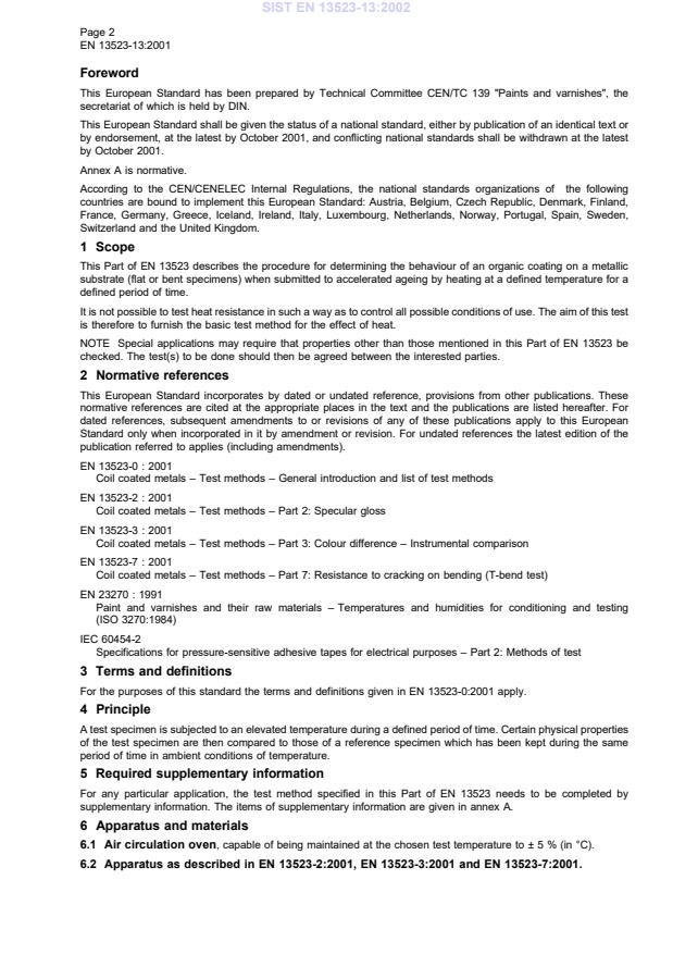 ScopeThis Part of EN 13523 describes the procedure for determining the behaviour of an organic coating on a metallicsubstrate (flat or bent specimens) when submitted to accelerated ageing by heating at a defined temperature for adefined period of time.It is not possible to test heat resistance in such a way as to control all possible conditions of use. The aim of this testis therefore to furnish the basic test method for the effect of heat.NOTE
