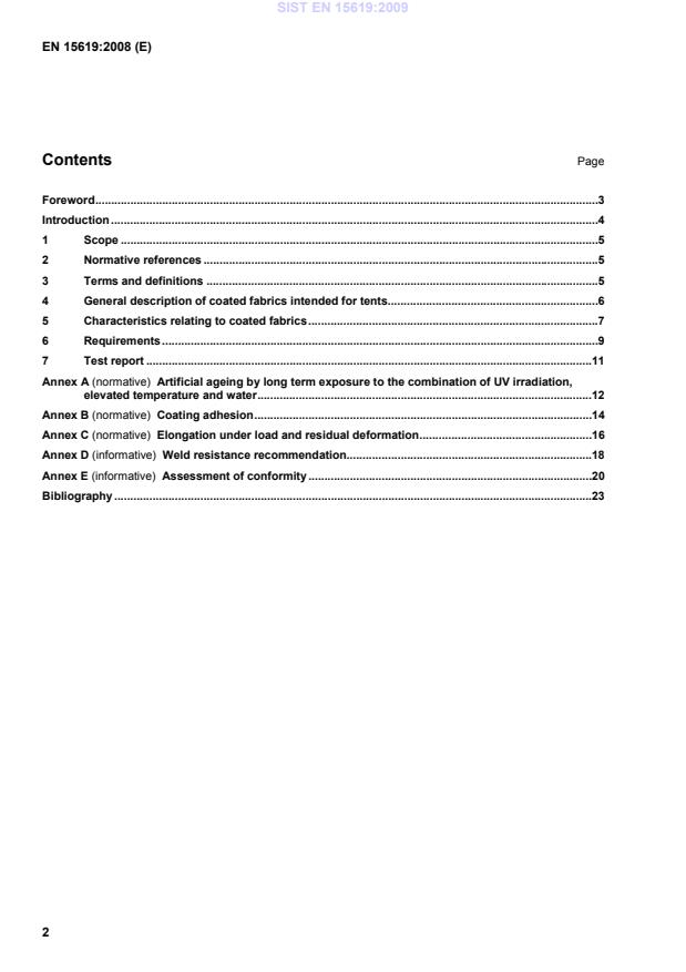 Plastic film and material other than coated fabrics are not covered by this European Standard. 2 Normative references The following referenced documents are indispensable for the application of this document. For dated references, only the edition cited applies. For undated references, the latest edition of the referenced document (including any amendments) applies. EN 1875-3, Rubber- or plastics- coated fabrics — Determination of tear strength — Part 3: Trapezoidal method EN 12280-1, Rubber- or plastics- coated fabrics - Acceleratd ageing tests — Part 1: Heat ageing EN 13782, Temporary structures – Tents – Safety EN 14115, Textiles — Burning behaviour of materials for marquees, large tents and related products — Ease of ignition EN 20105-A02, Textiles — Tests for colour fastness — Part A02: Grey scale for assessing change in colour (ISO 105-A02:1993) EN ISO 846, Plastics — Evaluation of the action of microorganisms (ISO 846:1997) EN ISO 1421, Rubber- or plastics-coated fabrics – Determination of tensile strength and elongation at break (ISO 1421:1998) EN ISO 2231, Rubber- or plastics-coated fabrics – Standard atmospheres for conditioning and testing (ISO 2231:1989) EN ISO 2286-2, Rubber- or plastics-coated fabrics – Determination of roll characteristics – Part 2: Methods for determination of total mass per unit area, mass per unit area of coating and mass per unit area of substrate (ISO 2286-2:1998) EN ISO 2411, Rubber- or plastics-coated fabrics – Determination of coating adhesion (ISO 2411:2000) EN ISO 4892-3, Plastics — Methods of exposure to laboratory light sources – Part 3: Fluorescent UV lamps (ISO 4892-3:2006) EN ISO 11925-2:2002, Reaction to fire tests – Ignitability of building products subjected to direct impingement of flame — Part 2: Single-flame source test (ISO 11925-2:2002) ISO 1420, Rubber- or plastics-coated fabrics – Determination of resistance to penetration by water 3 Terms and definitions For the purposes of this document, the following terms and definitions apply. SIST EN 15619:2009