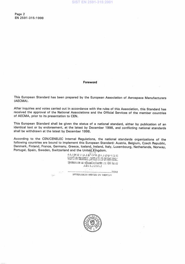 EN 2591-315:1998 has the following relationships with other standards: It is inter standard links to EN 2591-315:2015, EN 3645-001:2019. Understanding these relationships helps ensure you are using the most current and applicable version of the standard.