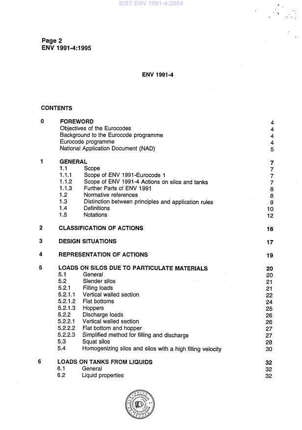 ENV 1991-4:1995 is a standardization document published by the European Committee for Standardization (CEN). Its full title is "Eurocode 1: Basis of design and actions on structures - Part 4: Actions in silos and tanks". This standard covers: Migrated from Progress Sheet (TC Comment) (2000-07-10): All dates refer to ENV. No Enquiry nor standstill ++ REAL dates of ENV taken out bec. of 2-Y-R; REAL32 = /; REAL40/49=9306; ++ REAL41/51/53=9306; REAL60 = 9505.