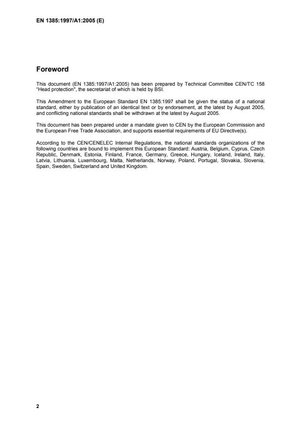 EN 1385:1997/A1:2005 is classified under the following ICS (International Classification for Standards) categories: 13.340.20 - Head protective equipment. The ICS classification helps identify the subject area and facilitates finding related standards.