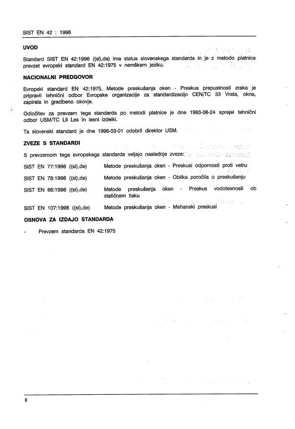 EN 42:1975 is a standard + national annex and/or foreword published by the European Committee for Standardization (CEN). Its full title is "Methods of testing windows - Air permeability test". This standard covers: Methods of testing windows - Air permeability test