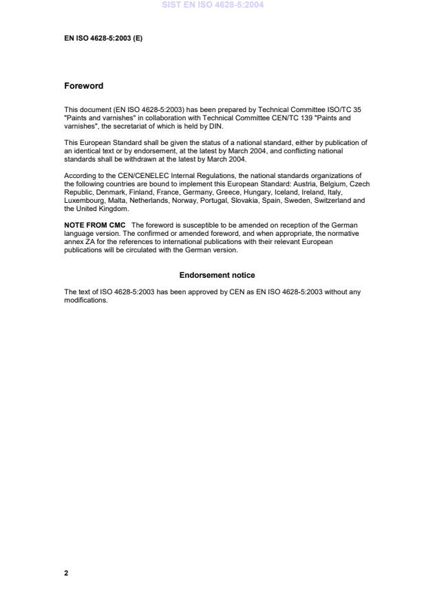 The foreword is susceptible to be amended on reception of the Germanlanguage version. The confirmed or amended foreword, and when appropriate, the normativeannex ZA for the references to international publications with their relevant Europeanpublications will be circulated with the German version.Endorsement noticeThe text of ISO 4628-5:2003 has been approved by CEN as EN ISO 4628-5:2003 without anymodifications.SIST EN ISO 4628-5:2004