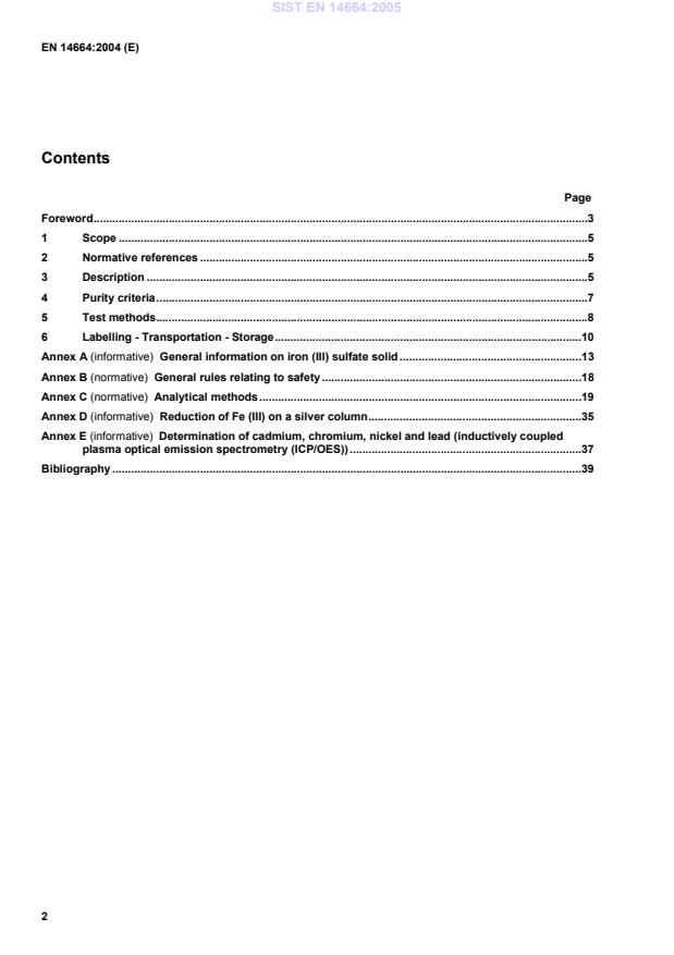 4.4 Chemical parameters The product shall conform to the requirements specified in Table 2. The concentration limits are specified in milligrams per kilogram of Fe (III). Table 2 – Chemical parameters Limit in mg/kg of Fe (III) Parameter Type 1 Type 2 Type 3 Arsenic (As) max. 1 20 50 Cadmium (Cd) max. 1 25 50 Chromium (Cr) max. 100 350 500 Mercury (Hg) max. 2,5 5 10 Nickel (Ni) max. 300 350 500 Lead (Pb) max. 2,5 100 400 Antimony (Sb) max. 10 20 60 Selenium (Se) max. 5 20 60 NOTE Cyanide (CN-) is usually not relevant because of the acidity of the product. Pesticides and polycyclic aromatic hydrocarbons are not relevant since the raw materials used in the manufacturing process are free of them. For maximum impact of iron (III) sulfate on trace metal content in drinking water see A.2. 5 Test methods 5.1 Sampling Observe the general recommendations in ISO 3165 and take into account ISO 6206. Prepare the laboratory sample required by the relevant procedure described in ISO 8213. SIST EN 14664:2005