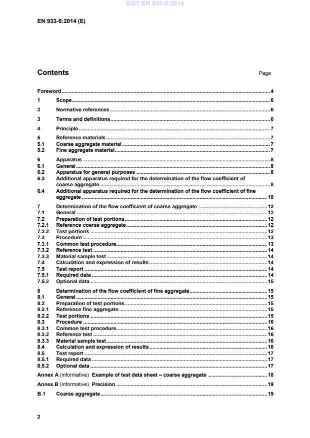Standard EN 933-6 določa referenčno metodo, ki se uporablja za tipsko preskušanje in v primeru spora za določevanje koeficienta pretoka grobih in finih agregatov. Za druge namene, zlasti za nadzor proizvodnje v obratu, se lahko uporabijo druge metode, če obstaja primerna delovna povezava z referenčno metodo. Primeri naprednih preskusnih metod so opisani v bibliografiji. Ta evropski standard se uporablja za grobe agregate v velikosti od 4 mm do 20 mm in za fine agregate v velikosti do 2 mm.