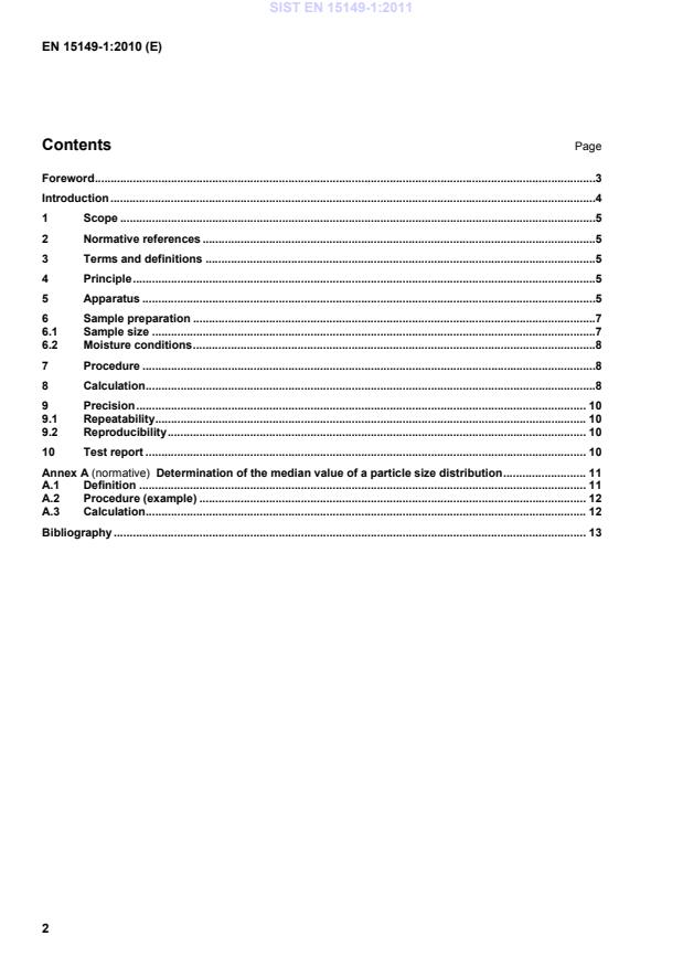 Determination of the median value of a particle size distribution . 11A.1Definition . 11A.2Procedure (example) . 12A.3Calculation . 12Bibliography . 13 SIST EN 15149-1:2011