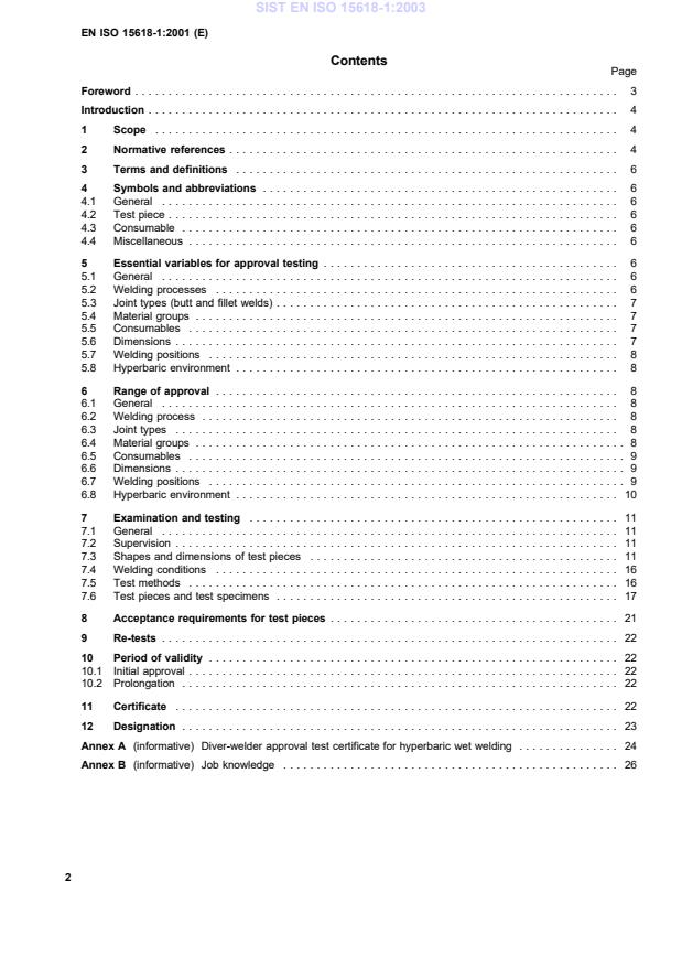 EN ISO 15618-1:2001 is a standard published by the European Committee for Standardization (CEN). Its full title is "Qualification testing of welders for under-water welding - Part 1: Diver-welders for hyperbaric wet welding (ISO 15618-1:2001)". This standard covers: This standard applies to welding processes where the skill of the diver-welder has a significant influence on weld quality. This standard specifies essential requirements, ranges of approval, test conditions, acceptance requirements and certification for the approval testing of diver-welder performance for the welding of steels underwater in hyperbaric wet environment. The recommended format for the certificate of approval testing is given in Annex A. During the approval test the diver-welder should be required to show adequate practical experience and job knowledge (test non mandatory) of the welding processes, materials and safety requirements for which he is to be approved, information on these aspects is given in Annex B. This standard is applicable when the diver-welder's testing is required by the purchaser, by inspection authorities or by other organisations. The welding processes referred to in this standard include those fusion welding processes which are designated as manual or partly mechanised welding. It does not cover fully mechanised and fully automatic processes (see 5.2). All new approvals should be in accordance with this standard from the date of this issue. However, this standard does not invalidate previous diver-welder approvals made to former national standards or specifications, providing the intent of the technical requirements is satisfied and the previous approvals are relevant to the application and production work on which they are employed. Also, where additional tests should be carried out to make the approval technically equivalent it is only necessary to do the additional tests on a test piece which should be made in accordance with this standard.