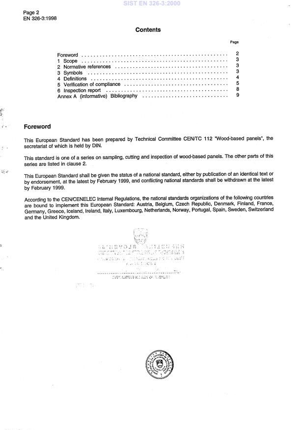 EN 326-3:1998 is a standard published by the European Committee for Standardization (CEN). Its full title is "Wood-based panels - Sampling, cutting and inspection - Part 3: Inspection of a consignment of panels". This standard covers: This European Standard specifies methods for the verification of compliance of one or more properties of a consignment of panels with the requirements of a contract, or with the claimed values of properties of panels in a consignment as documented by the supplier. This European Standard is not applicable for the internal or external control of conformity of products in the factory. For these purposes, prEN 326-2 applies. In this standard, verification of compliance is based on the testing of small test pieces.