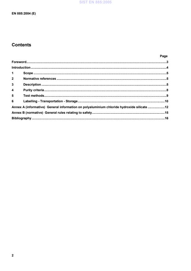 EN 885:2004 is the CEN (European Committee for Standardization) standard that specifies requirements for polyaluminium chloride hydroxide silicate used in the treatment of water intended for human consumption. The document describes the product’s identity, physical and chemical properties, minimum purity criteria, analytical and sampling methods, labelling, transportation and storage requirements, and rules for safe handling (Annex B). It cross-references analytical methods in EN 1302 and sampling guidance in ISO 3165 and ISO 6206.
