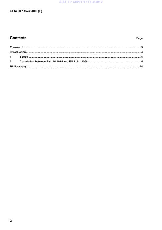 CEN/TR 115-3:2009 is a technical report published by the European Committee for Standardization (CEN). Its full title is "Safety of escalators and moving walks - Part 3: Correlation between EN 115:1995 and its amendments and EN 115-1:2008". This standard covers: This technical report applies to escalators and moving walks built in accordance with EN 115-1:2008.
