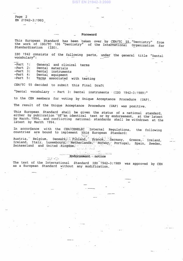 EN 21942-3:1993 is a standard published by the European Committee for Standardization (CEN). Its full title is "Dental vocabulary - Part 3: Dental instruments (ISO 1942-3:1989)". This standard covers: Text was withdrawn on 2010-04-16 by TC resolution.