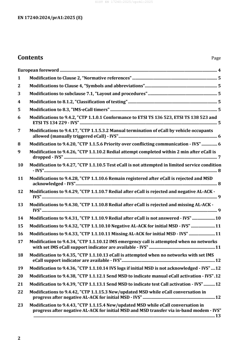 EN 17240:2024/prA1 is a draft published by the European Committee for Standardization (CEN). Its full title is "Intelligent transport systems - ESafety - ECall end to end conformance testing for IMS packet switched based systems". This standard covers: This document defines the key actors in the eCall chain of service provision using IMS over packet switched networks (such as LTE/4G) as: 1) In-vehicle system (3.20) (IVS)/vehicle, 2) Mobile network Operator (MNO), 3) Public safety answering point (3.27) (PSAP), and to provide conformance tests for actor groups 1) - 3). NOTE 1 Conformance tests are not appropriate nor required for vehicle occupants (3.36), although they are the recipient of the service. NOTE 2 Third party eCall systems (TPS eCall) are not within the scope of this deliverable. This is because the core TPS-eCall (3.32) standard (EN 16102) does not specify the communications link between the vehicle and the TPS service provider (3.29). NOTE 3 These conformance tests are based an the appropriate conformance tests from EN 16454 which was published before Internet Protocol multimedia Systems (IMS) packet switched networks were available. This deliverable therefore replicates the appropriate tests from EN 16454 (and acknowledge their source); adapt and revise Conformance Test Protocols (CTP) from EN 16454 to an IMS paradigm; or provide new additional tests that are required for the IMS paradigm. Some 14 112-eCall (Pan European eCall) tests provided in EN 16454 are specific to GSM/UMTS circuit switched communications and not appropriate for the IMS paradigm and are therefore excluded from this deliverable. This document therefore provides a suite of ALL conformance tests for IVS equipment, MNO's, and PSAPS, required to ensure and demonstrate compliance to CEN/TS 17184. NOTE 4 Because in the event of non-viability or non-existence of an IMS supporting network at any particular time/location, IMS-eCall systems revert to CS networked eCall systems eCall via GSM/UMTS, IVS and PSAPs need to support, and prove compliance to both IMS and CS switched networks. The Scope covers conformance testing (and approval) of new engineering developments, products and systems, and does not imply testing associated with individual installations in vehicles or locations.