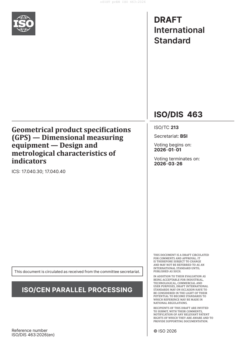 prEN ISO 463 is a draft published by the European Committee for Standardization (CEN). Its full title is "Geometrical product specifications (GPS) - Dimensional measuring equipment - Design and metrological characteristics of indicators (ISO/DIS 463:2025)". This standard covers: ISO 463:2006 specifies the most important design and metrological characteristics of mechanical dial gauges.