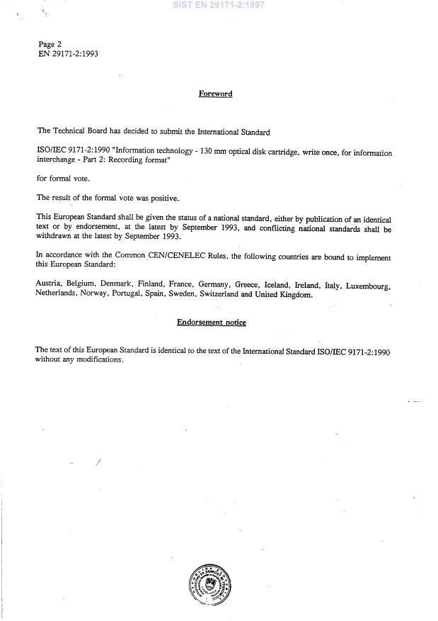 ISOPIEC 9171-2:1990 (E) INTRODUCTION ISO/IEC 9171 specifies the characteristics of 130 mm Optical disk cartridges (ODC) of the type providing for information to be written once and read many times. ISOAEC 9171-1 specifies definitions of the essential concepts; the environment in which the characteristics are to be tested; the environment in which the cartridge is to be operated and stored; - the mechanical, physical and dimensional characteristics of the case and of the Optical disk; - the Optical characteristics and the recording characteristics for recording the information once and for reading it many times, so as to provide physical interchangeability between data processing Systems. ISOAEC 9171-1 and ISO/IEC 9171-2, together with a Standard for volume and file structure, provide for full data interchange between data processing Systems. SIST EN 29171-2:1997