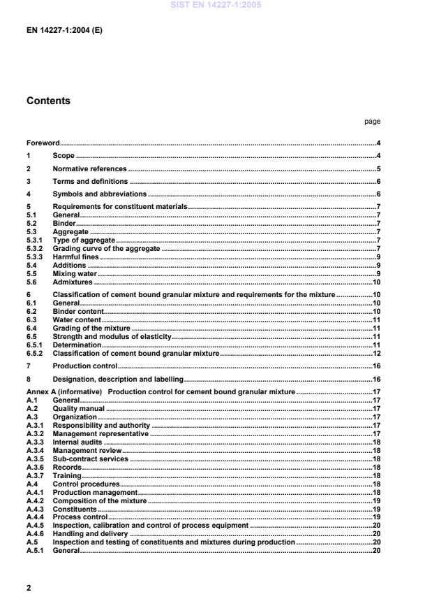 Production control for cement bound granular mixture.17 A.1 General.17 A.2 Quality manual.17 A.3 Organization.17 A.3.1 Responsibility and authority.17 A.3.2 Management representative.17 A.3.3 Internal audits.18 A.3.4 Management review.18 A.3.5 Sub-contract services.18 A.3.6 Records.18 A.3.7 Training.18 A.4 Control procedures.18 A.4.1 Production management.18 A.4.2 Composition of the mixture.19 A.4.3 Constituents.19 A.4.4 Process control.19 A.4.5 Inspection, calibration and control of process equipment.20 A.4.6 Handling and delivery.20 A.5 Inspection and testing of constituents and mixtures during production.20 A.5.1 General.20 SIST EN 14227-1:2005