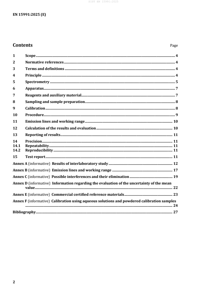 - Clauses and annexes provide details on emission lines, limits of determination, interlaboratory precision, interference elimination and uncertainty evaluation.