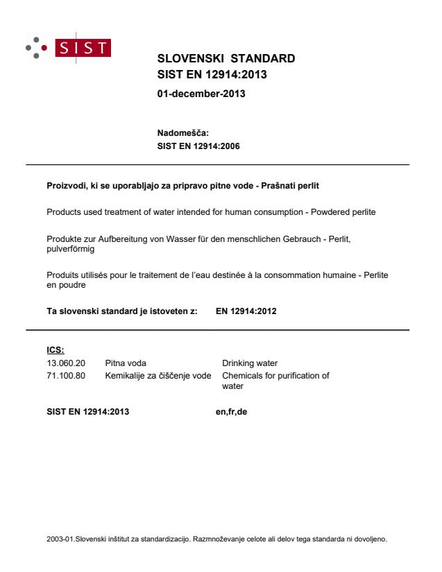 2003-01.Slovenski inštitut za standardizacijo. Razmnoževanje celote ali delov tega standarda ni dovoljeno.Proizvodi, ki se uporabljajo za pripravo pitne vode - Prašnati perlitProdukte zur Aufbereitung von Wasser für den menschlichen Gebrauch - Perlit, pulverförmigProduits utilisés pour le traitement de l’eau destinée à la consommation humaine - Perlite en poudreProducts used treatment of water intended for human consumption - Powdered perlite71.100.80Chemicals for purification of water13.060.20Pitna vodaDrinking waterICS:Ta slovenski standard je istoveten z:EN 12914:2012SIST EN 12914:2013en,fr,de01-december-2013SIST EN 12914:2013SLOVENSKI