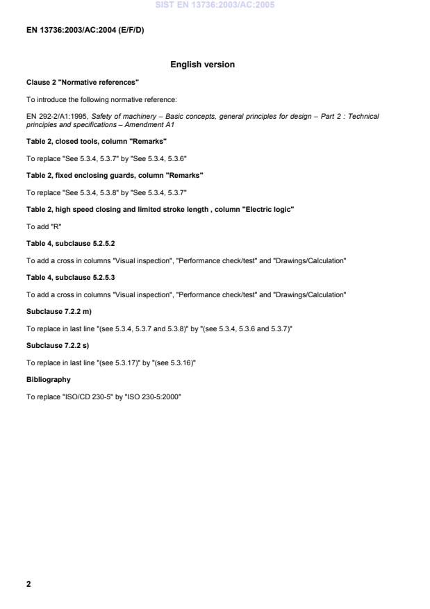 EN 13736:2003/AC:2004 is a corrigendum published by the European Committee for Standardization (CEN). Its full title is "Safety of machine tools - Pneumatic presses". This standard covers: TC - Various editorial modifications troughout the text