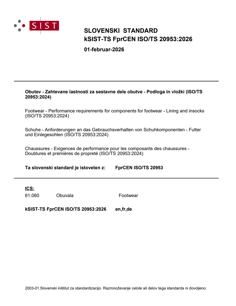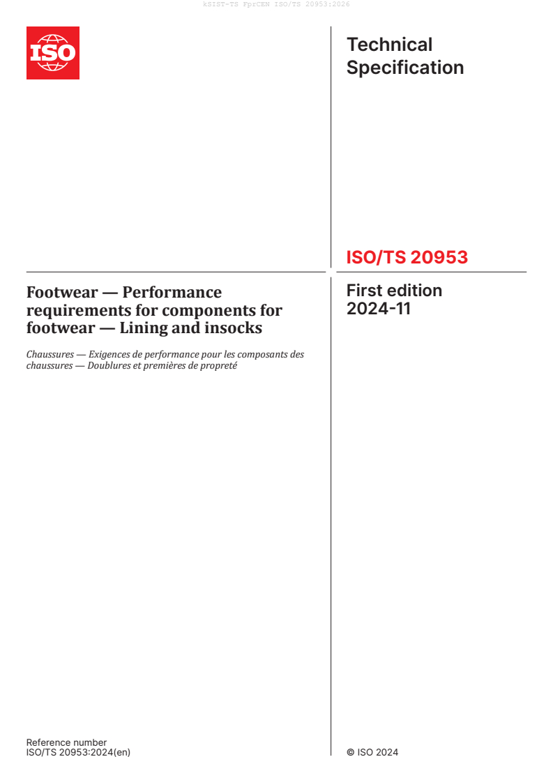 Footwear - Performance requirements for components for footwear - Lining and insocks (ISO/TS 20953:2024)