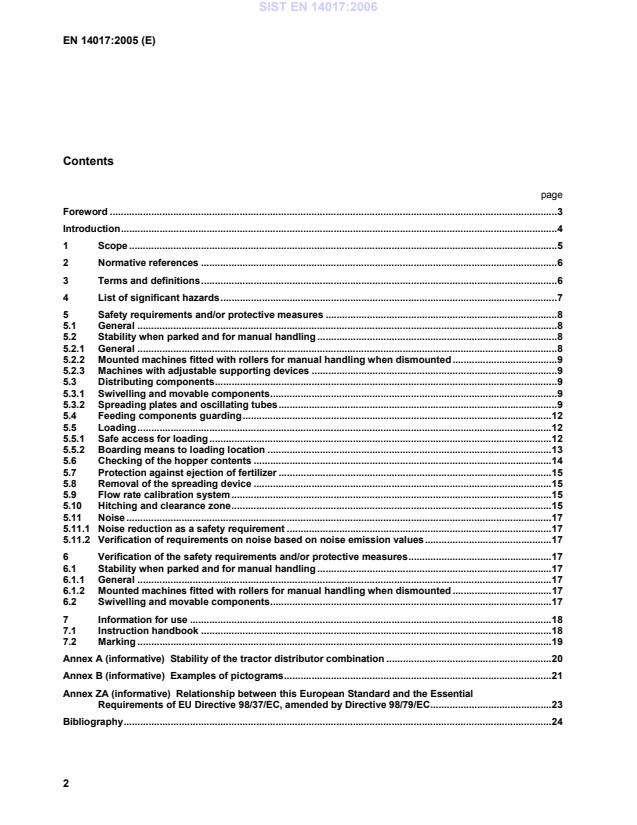EN 14017:2005 is a standard published by the European Committee for Standardization (CEN). Its full title is "Agricultural and forestry machinery - Solid fertilizer distributors - Safety". This standard covers: This European Standard, applied together with EN 1553, specifies the safety requirements and their verification for the design and construction of mounted, semi-mounted, trailed or self-propelled fertilizer distributors for solid fertilizer application, i.e. full width solid fertilizer distributors, solid fertilizer broadcasters, distributors with oscillating tube and line-distributors as well as solid fertilizer distributors driven by an auxiliary engine to be used by one operator only, used in agriculture, horticulture and in forestry. In addition, this European Standard specifies the type of information on safe working practices (including residual risks) to be provided by the manufacturer. When requirements of this European Standard are different from those which are stated in EN 1553 the requirements of this European Standard take precedence over the requirements of EN 1553 for machines that have been designed and built according to the provisions of this European Standard. It does not apply to: combined seed and fertilizer drills; machines for distributing granulated pesticides; pedestrian controlled distributors; knapsack distributors. This European Standard deals with all the significant hazards, hazardous situations and events relevant to solid fertilizer distributors, when they are used as intended and under the conditions foreseen by the manufacturer (see Clause 4), excepting the hazards arising from: inadequate lighting of moving/working area; inadequate visibility from drivers/operators position; inadequate seating; travelling functions (drive, braking etc.); rolling over; equipment for loading fertilizer into the machine; an auxiliary engine. It is not applicable to electromagnetic compatibility (EMC) nor to environmental hazards (except noise). These aspects are covered by EN 13739-1, EN 13739-2:2003, EN 13740-1:2003 and EN 13740-2:2003.