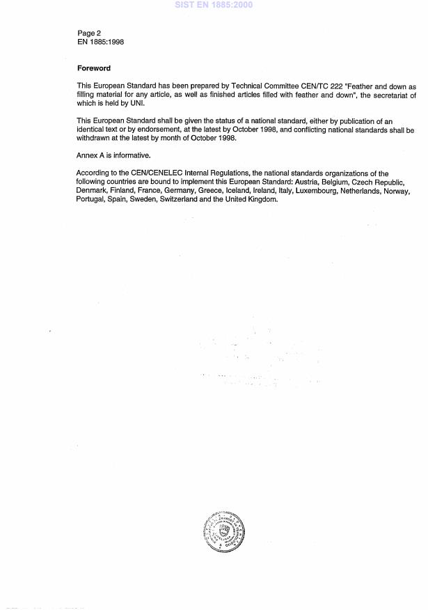EN 1885:1998 is a standard published by the European Committee for Standardization (CEN). Its full title is "Feather and down - Terms and definitions". This standard covers: This European standard defines the principal terms used in the field of feather and down.